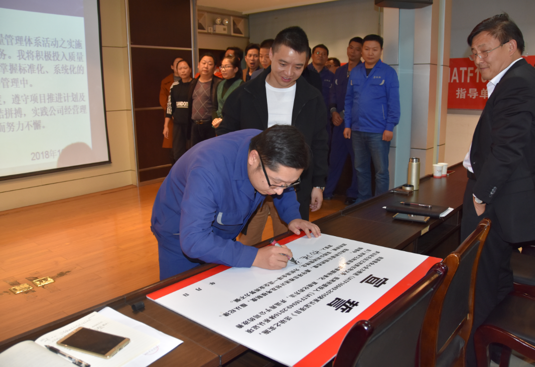 會上,質量管理體系推進小組成員進行了集體宣誓并現場簽名,充分展示了開展《質量管理體系提升》項目工作的決心。相信在公司上下一心、積極努力下,湖北佳恒科技股份有限公司一定能真正實現質量管理體系提升,將IATF16949:2016質量管理體系在企業(yè)內部有效運行,為企業(yè)持續(xù)健康發(fā)展保駕護航!