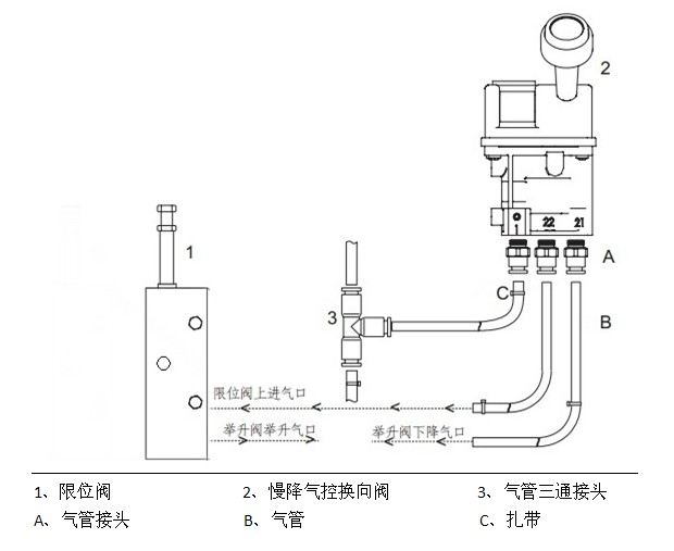 1、慢降組合控制氣閥安裝到駕駛座椅旁邊,安裝支撐架必須結(jié)實牢固。